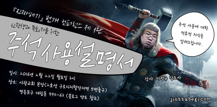 장소가 협소한 관계로 40팀(총44명)이 신청하여 주신 2.13. 22:55 현재 신청을 더 이상 받지 않도록 하겠습니다. 이렇게 많이 관심 보여주실 줄 몰랐네요. 정말 감사합니다. ^^ 그럼 당일 뵙도록 하겠습니다. 문의가 있어서 몇 가지만 공지해드립니다.1.구체적 사항은 다음주 초 중에 문자로 발송해드리겠습니다.2.주차 공간은 넉넉합니다. 차 가져오셔도 됩니다. ^^ 3.다시 한 번 말씀드리지만 컴퓨터 프로그램은 옵션입니다. 강의는 컴퓨터 위주로 이루어지지 않고 말 그대로 주석 사용설명서입니다. 없으신 분들 걱정 말고 오셔도 됩니다. ————- 진짜배기에서 번개 컨퍼런스를 개최합니다. 성경을 알고 싶어서 찾았던 주석, 그러나 주석이 더 어려워서 이미 절망하신 당신을 위해 – 어떤 주석이 있는지 – 어떤 주석이 좋은지 – 주석은 어떻게 사용해야 하는지 에 대한 덕후적 지식을 …