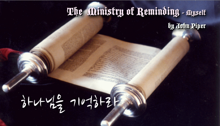 The Ministry of Reminding – myself 존 파이퍼 원문보기 희망의 가장 큰 적 중 하나는 하나님의 약속을 잊는 것입니다. 기억하는 것은 위대한 사역입니다. 베드로와 바울은 이런 이유로 서신을 기록했습니다.(벧후 1:12; 롬 15:15) 기억하게 하시는 분은 주로 성령이십니다(요 14:26). 그러나 수동적이 되지 마십시오. 여러분 자신이 기억하도록 하는 일의 책임은 여러분에게만 있습니다. 그리고 여러분이 제일 먼저 기억해야하는 것은 여러분 자신입니다. 생각은 큰 힘이 있습니다: 그것은 스스로에게 말할 수 있습니다. 생각은 ‘기억할 수’ 있습니다. “이것을 내가 내 마음에 담아 두었더니 그것이 오히려 나의 소망이 되었사옴은 여호와의 인자와 긍휼이 무궁하시므로” (애 3:21-22)를 예로 들 수 있습니다. 만약 우리가 하나님이 자신과 우리에 …