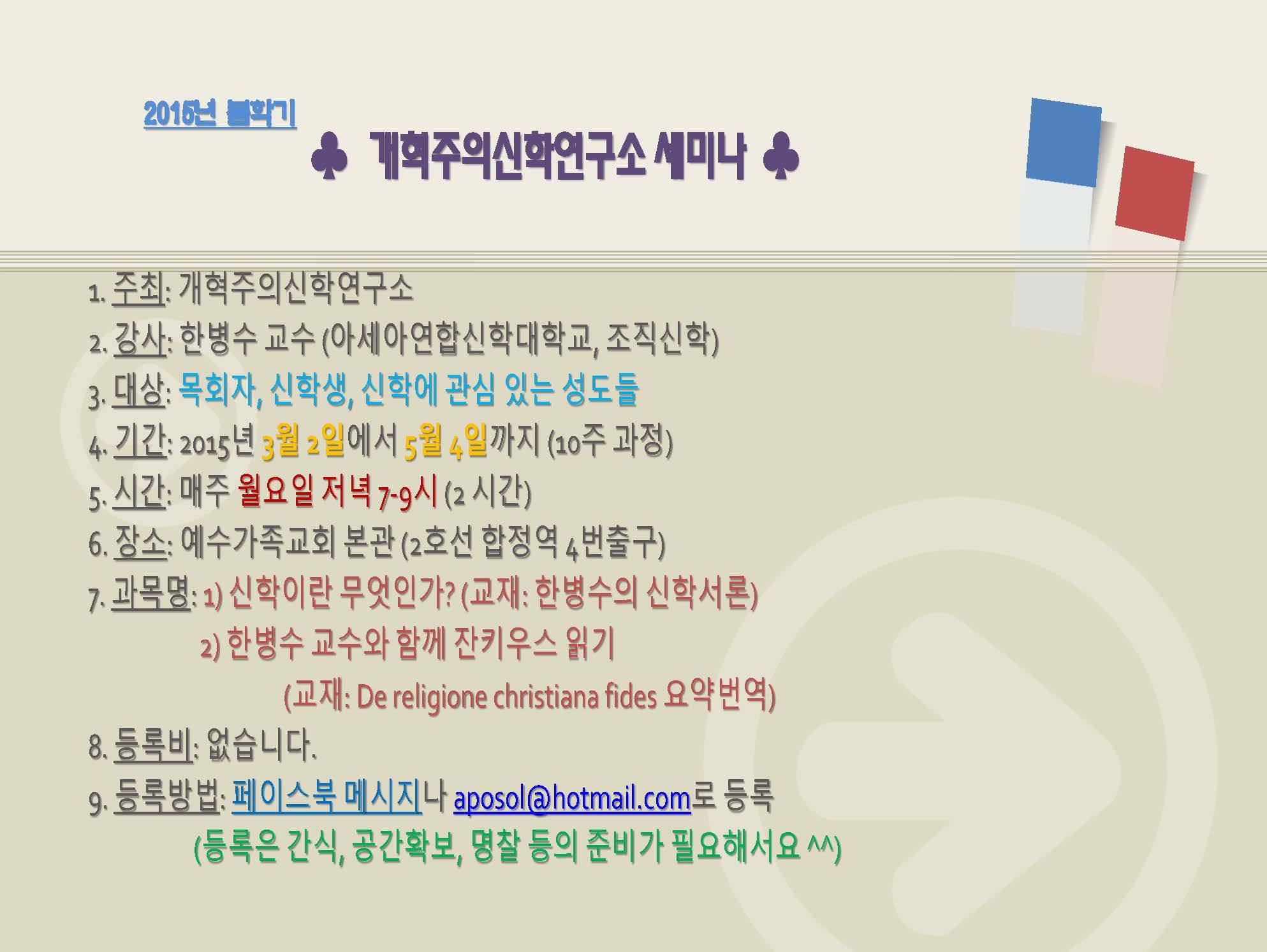 더 다양한 이유들이 있을 수 있습니다. 개인적으로는 신학을 단지 학문적으로서만이 아니라 신앙과 경건을 위해 어떻게 접근해야 하는지, 그리고 통합적인 신학을 어떻게 추구해야 하는지에 대해 많은 유익을 얻을 수 있는 세미나라고 생각합니다.