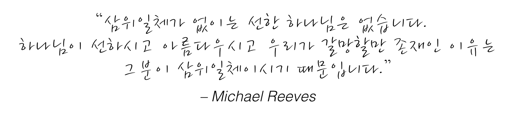 Reeves: 이렇게 된 건, 처음 미국 IVP에 갔을 때 이미 ‘선하신 하나님’과 매우 비슷한 제목의 책이 출판되어 있다고 말해주었어요. 그 책 이름은 기억이 안 나는데 출판사에서는 독자들이 헷갈릴 수도 있다고 생각했죠. 결국 출판사에서 ‘삼위일체 안에서 기뻐함’이라고 이름을 지었습니다. 그리고 전 두 제목 모두 좋아요. 각자가 보여주는 게 있습니다. ‘선하신 하나님’이라는 제목의 경우엔 오직 이 하나님, 삼위일체인 하나님만이 우리가 원하는 선하신 하나님이라는 사실을 보여줍니다.