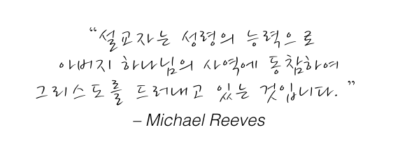 Reeves: 삼위일체는 설교에 대한 높은 입장을 가지게 합니다. 왜냐하면 우리는 삼위일체에서 아버지 하나님께서 영원한 설교자이심을 보기 때문입니다. 하나님께서는 영원토록 당신의 말씀을 말씀하고 계십니다. ( 영광: 그의 아들이군요.) 그렇죠. 그의 아들이요. 성령의 능력으로요. 창세기 1장에서 천지를 창조하실 때 하나님의 말씀이 성령의 능력으로 나갔습니다. 하나님은 이런 분이신 거죠. 그분은 영원한 설교자이십니다. 당신의 말씀을 전달하십니다. 그러니 설교자는 하나님의 생명에 동참하는 셈입니다. 아버지 하나님께서는 아들을 세상에 보내셨습니다. 그리고 설교자는 이 사역에 동참하는 것이죠. 이 사실은 설교자에게 놀라운 격려가 됩니다. 나는 단지 어떤 소식을 팔러다니는 세일즈맨이 아니라 설교를 통해 아버지 하나님께 동참하는구나.라고 깨닫게 됩니다. 또한 설교자로서 하나님께서 말씀하시는 내용을 알게 됩니다. 하나님께서는 단지 정보를 다운로드 해주시는 것이 아닙니다. 이 열 가지 것들을 알겠니? 라고 하시는 게 아니죠. 그분의 설교는 자기 자신을 우리에게 주신 것이었어요! 아버지 하나님께서 아들을 우리에게 주신 것은 자기 자신을 우리에게 주신 것입니다. 우리가 설교할 때 바로 이 일이 일어나는 것입니다. 설교자로서 설교할 때 단지 사람들에게 정보를 전달하는 것이 아니라, 물론 정보가 전달되지만요, 더 많은 일을 하고 있는 겁니다. 그리스도를 드러내고 그리스도를 가지도록 하는 것입니다. 단지 정보 뭉치를 전달하는 것이 아니라 그분을 가지도록 하는 것이죠. 따라서 삼위일체는 설교할 때 우리에게 담대함을 주며 설교자가 무엇을 하는지를 알게 해줍니다. 설교자는 성령의 능력으로 아버지 하나님의 사역에 동참하여 그리스도를 드러내고 있는 것입니다. 그리고 설교할 때 그리스도 중심이 되게 합니다. 왜냐하면 아버지께서 설교자로서 그리스도 중심적이시기 때문입니다. 아버지께서 발하시는 모든 말씀은 예수 그리스도시니까요. 성령의 사역도 요한복음 15:26에 따르면 그리스도를 증언하는 것입니다. 성령의 감동을 받은 말씀 또한 그리스도를 증언합니다. 아버지의 목표와 성령이 원하시는 것과 말씀의 증언은 모두 그리스도를 가리키는 것이죠. 만약 내가 삼위일체적인 설교자가 되고 싶다면 전 반드시 그리스도 중심적 설교자여야 합니다. 아버지께서 그러하시듯이, 성령과 말씀이 그러하시듯이 그리스도를 드러내야 합니다. 그래서 설교자가 누구인지, 설교가 무엇인지에 대한 높은 관점을 가지게 됩니다. 삼위일체는 설교가 단지 사람들을 즐겁게 해주는 것이나 도덕적 교훈을 하거나 정보를 전달하는 것이라고 생각하지 못하도록 합니다. ‘아니지. 설교는 생명이신 그리스도를 드러내는 것이지.’라고 말하게 됩니다.