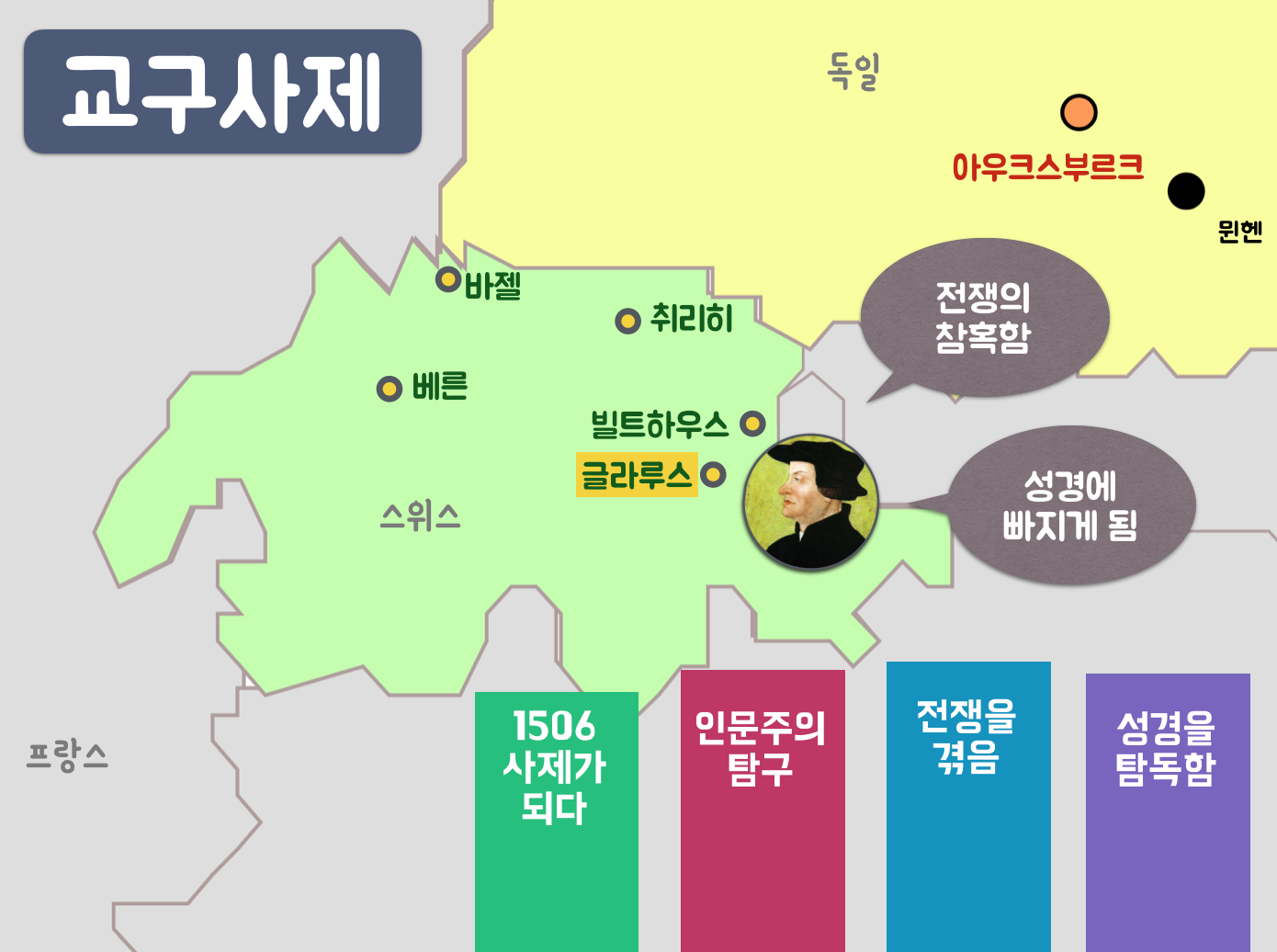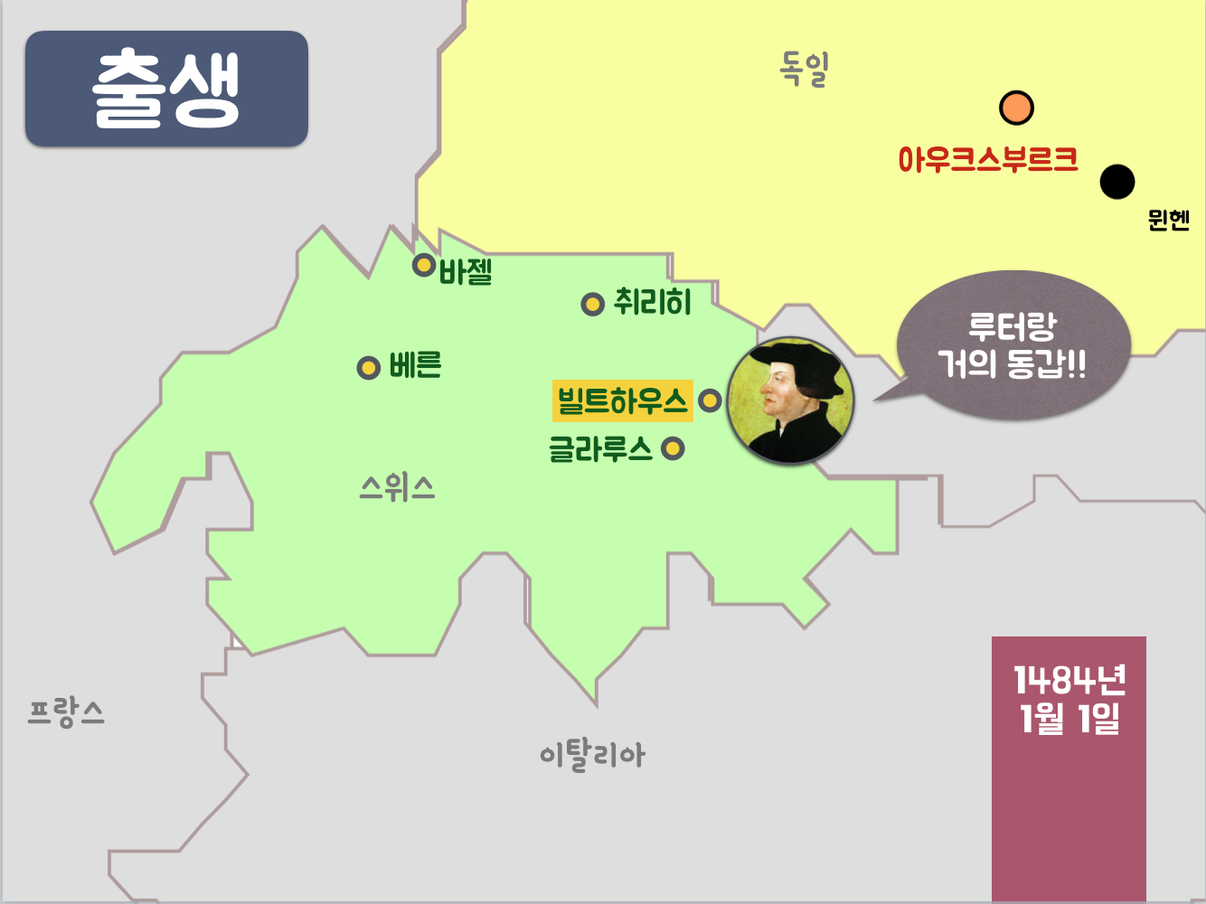 그는 1484년 1월 1일에 스위스 내의 빌트하우스라는 지역에서 태어났는데요, 루터와 거의 같은 나이입니다. 공식적으로 루터의 생년은 1483년으로 보는데, 1484년으로 보는 이들도 있습니다. 츠빙글리는 바젤(Basel)과 베른(Bern), 그리고 지금의 오스트리아 지역인 비엔나 대학교 등에서 공부했고 인문주의를 접하게 됩니다. 츠빙글리는 22살의 나이에 글라루스(Glarus) 지역의 교구 사제가 됩니다. 인문주의를 접했고 관심이 많았던 그는 헬라어도 잘했는데, 사실 사제들 중에서 츠빙글리처럼 인문주의에 관심을 두고 공부하는 것이 일반적이지는 않았다고 합니다.