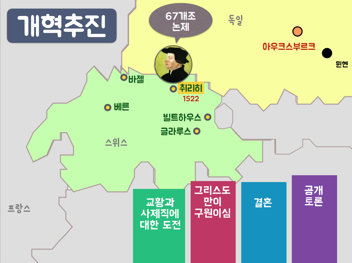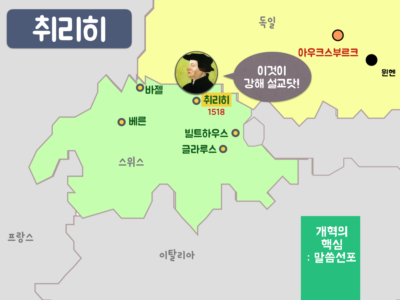 지난 포스팅까지는 독일에서 종교개혁을 위해 힘쓴 루터와 멜란히톤에 대해서 살펴봤습니다. 이번에는 옆쪽 동네인 스위스로 넘어가보겠습니다. 스위스에서 활동한 종교개혁가 중에 우리가 아는 가장 유명한 사람은 물론 칼빈이겠지만, 그보다 먼저 츠빙글리라는 사람을 살펴보겠습니다. 울리히 츠빙글리(Ulrich Zwingli)는 스위스의 취리히 지역에서 종교개혁을 이끈 지도자였습니다.