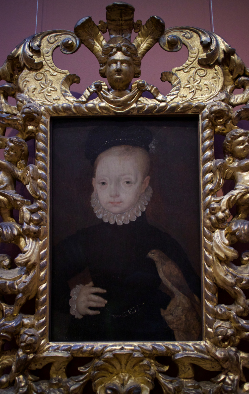 제임스 6세는 자신의 어머니 스코틀랜드 여왕 메리의 강제 퇴위 이후, 태어난지 13개월 만에 왕이 되었다. 이 그림에서 네덜란드 작가 아놀드 브롱코르스트는 관례대로 제임스 6세를 어른처럼 묘사했다. 제임스 6세는 당시 유행하는 윗옷과 모자를 입고 있으며, 장갑을 낀 왼손은 새매sparrow-hawk를 붙들고 있다.