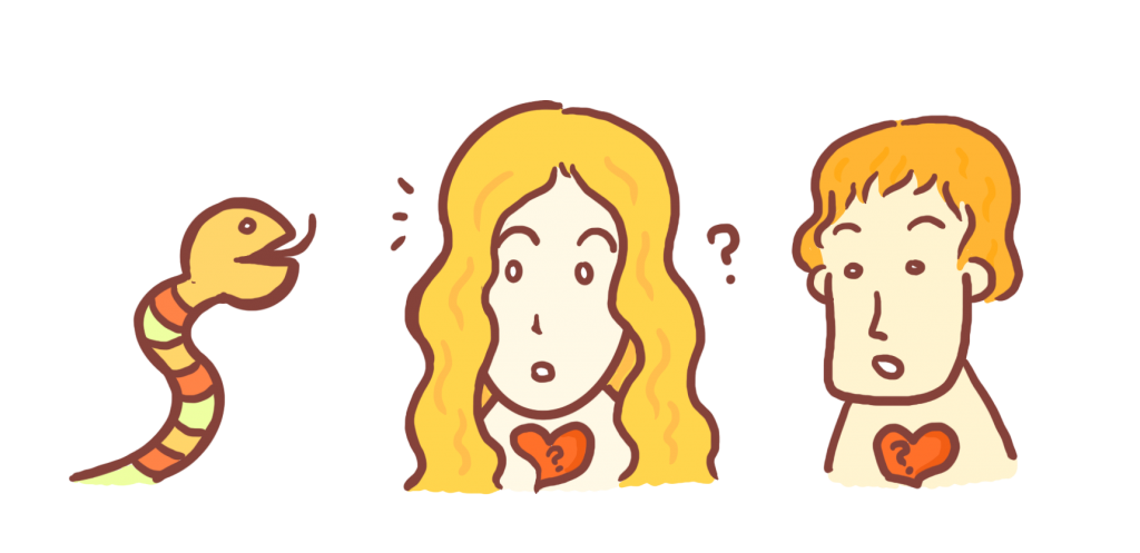 그런데 아담과 하와에게 뱀이 다가왔어요. 그리고는 선악을 알게하는 나무의 열매, 즉 선악과를 먹으라고 유혹했어요. 아담과 하와는 어떻게 했을까요? 안타깝게도 아담과 하와는 뱀의 거짓말에 속아서 선악과를 먹었어요. 하나님께서 먹지 말라고 말씀하셨는데, 왜 그 명령을 어겼을까요? 뱀은 선악과를 먹으면 아주 좋은 일이 생기고 행복해질 거라고 유혹했답니다. 바로 이 선악과를 먹으면 하나님처럼 된다고 말이죠.