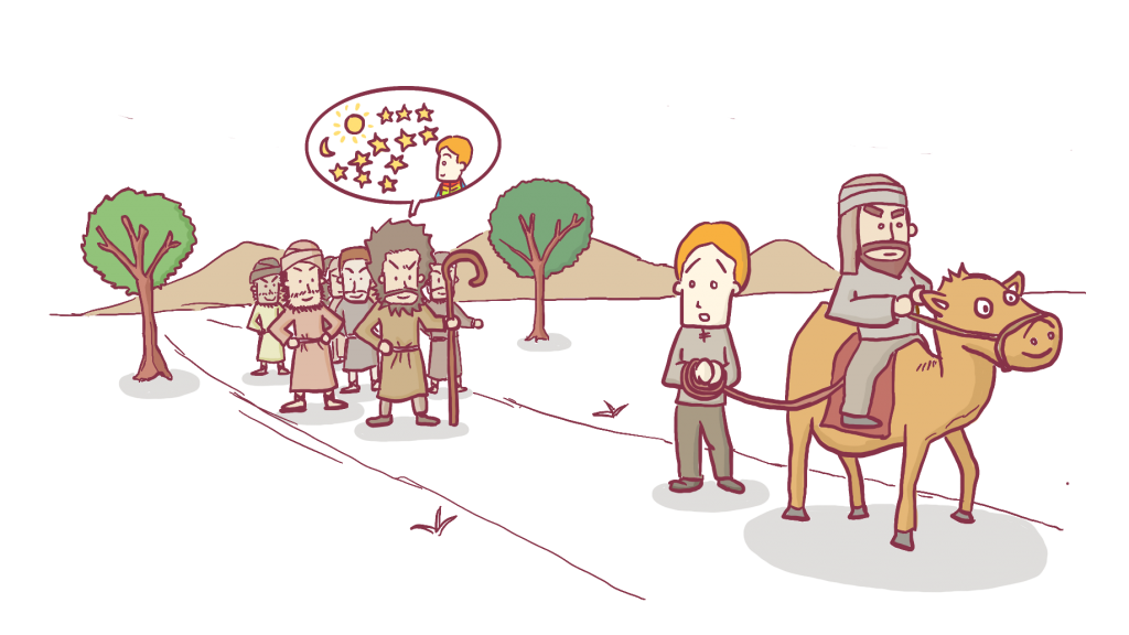 야곱에게는 아들이 열두 명이었어요. 야곱은 요셉을 가장 사랑했답니다. 요셉에게만 멋진 옷을 만들어줄 정도였어요. 그래서 형들은 요셉을 미워했어요. 사실 어린 요셉은 종종 형들이 잘못한 일들을 아빠인 야곱에게 말했어요. 그리고 특이한 꿈을 꾸기도 했어요. 해와 달과 열한 별이 요셉에게 절하는 꿈을 꿨고요. 또한 열한 개의 곡식을 묶은 뭉치가 자기에게 절하는 꿈도 꿨어요. 이 꿈들을 이야기하자 형들은 화를 냈어요. 요셉이 대장이 되고 열한 명의 형제들이 요셉을 섬기게 된다는 말이었기 때문이에요. 그들은 더욱더 요셉을 미워하게 되었죠.