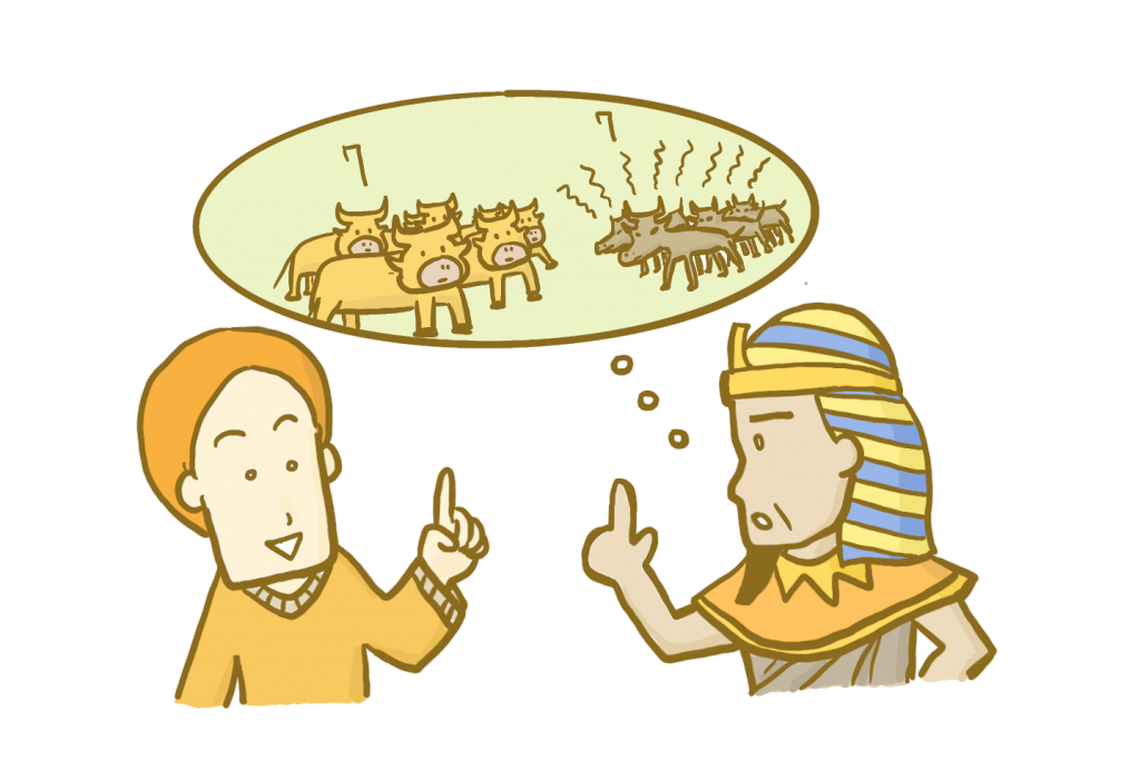 하지만 이 일이 불행하게 끝나지는 않았어요. 여전히 하나님은 요셉을 돌보고 계셨거든요. 어느 날, 이집트의 왕이었던 바로가 두 개의 이상한 꿈을 꾸었어요. 첫 번째 꿈에는 7마리 살진 소와 7마리 메마른 소가 나왔어요. 메마른 소가 살진 소를 잡아먹어 버렸죠. 두 번째 꿈에서는 풍성하게 열매가 맺힌 이삭 7개와 메마른 이삭 7개가 나왔어요. 그리고는 메마른 이삭이 풍성한 이삭을 삼켜 버렸죠.