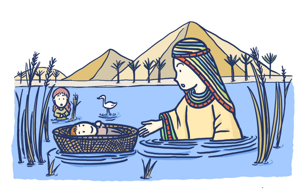이스라엘의 레위의 자손 중에 한 여인이 아들을 낳았어요. 사람들에게 들키면 아기는 죽을 수밖에 없었죠. 그래서 그 여인은 갈대로 작은 배 같은 상자를 만들고 아이를 상자에 넣어서 나일 강에 띄워 보냈답니다. 누군가 아이를 구해서 키워주길 기도했을 거에요. 그리고 마침 목욕하던 이집트 공주가 상자를 발견했어요!