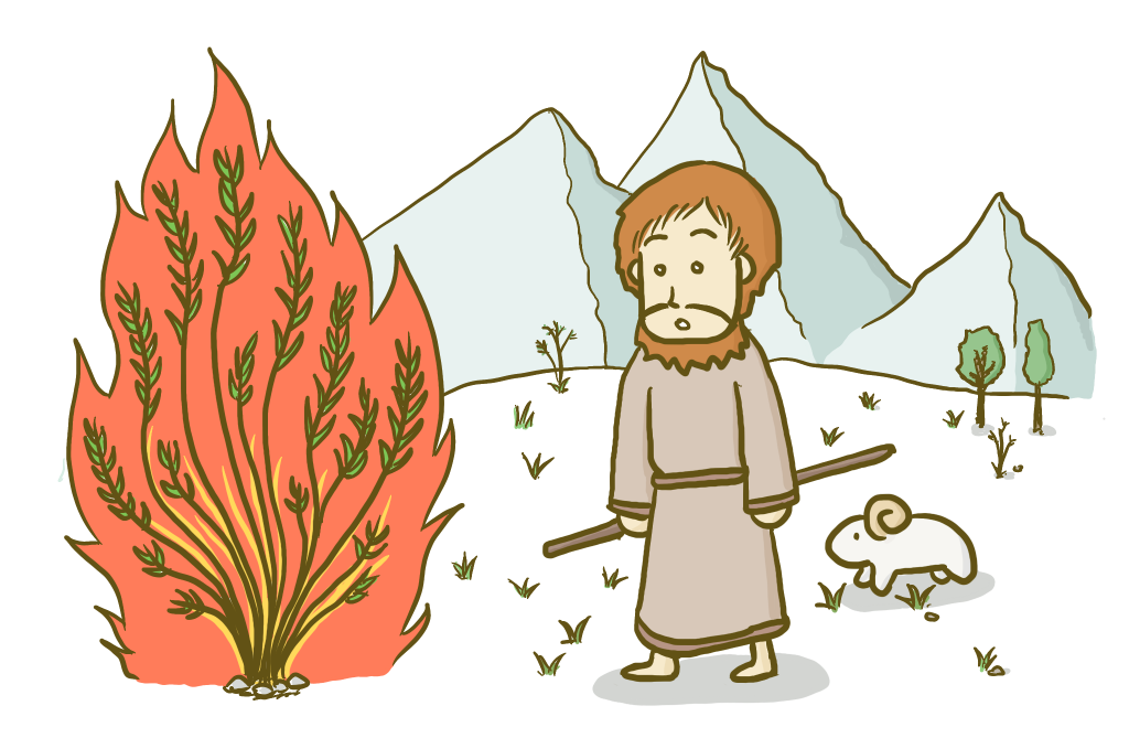 그러던 어느날 모세는 양들을 데리고 돌아다니다가 신기한 장면을 보았어요. 떨기나무에 불이 붙었는데, 나무가 불타 사라지지 않고 계속 불이 붙어있는 거에요. 신기해서 다가가는데 하나님이 모세에게 말씀하셨어요. 하나님이 나무에 불이 붙은 모습으로 모세에게 나타나신거에요. 왜 하나님은 모세를 찾아오셨을까요?