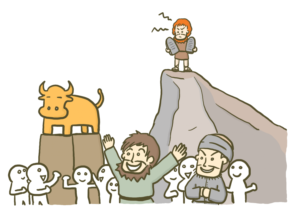 금송아지가 만들어지자 이스라엘 사람들는 축제를 벌이고 신나게 춤을 췄어요. 그리고 그 모습을 산에서 내려오던 모세가 보게 되었어요. 모세는 십계명을 받아서 산에서 내려오고 있었거든요. 모세는 화가 났어요. 그리고 하나님도 화가 나셨죠.