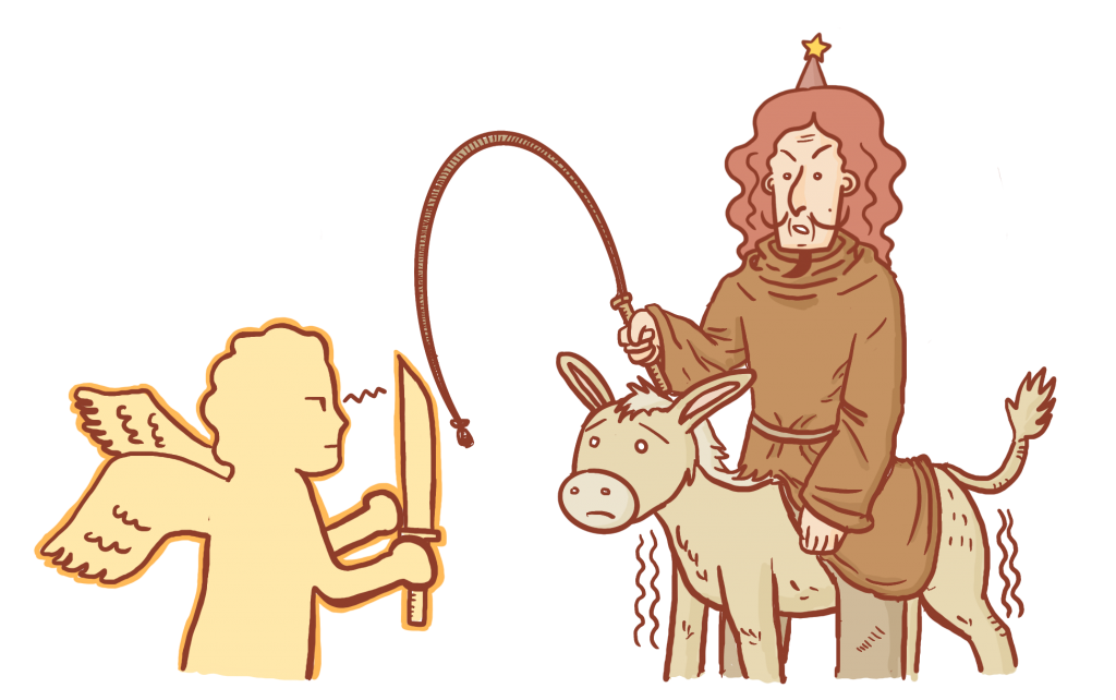 발람은 놀랐겠지만 나귀에게 화를 냈어요. “네가 나를 거역하기 때문이니 내 손에 칼이 있었더면 곧 너를 죽였으리라”라고 대답했죠. 하지만 나귀는 발람에게 자신이 이유 없이 되돌아가려고 한 게 아니라고 이야기했죠.