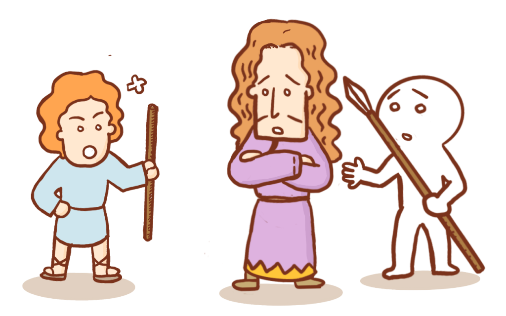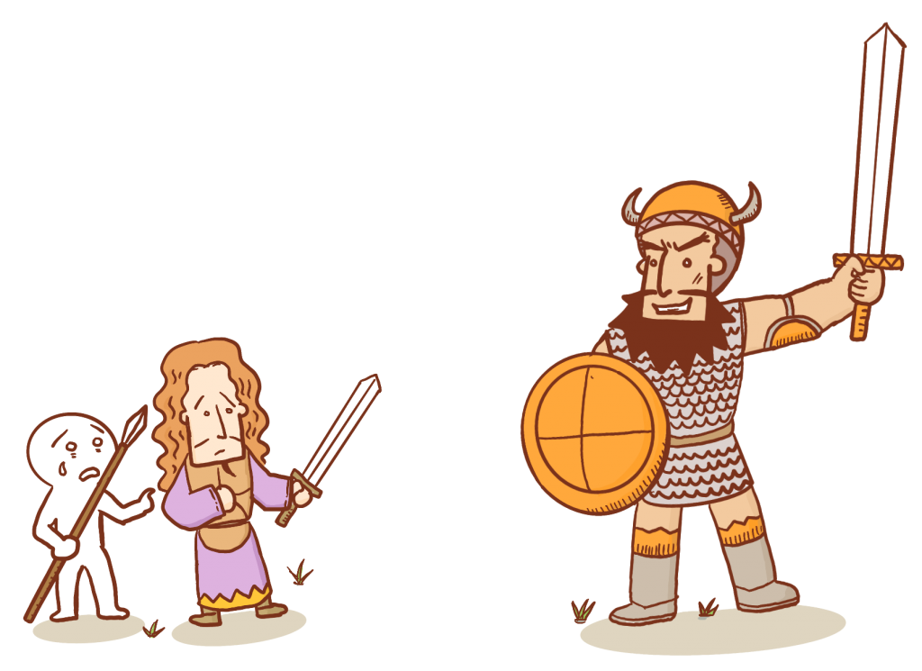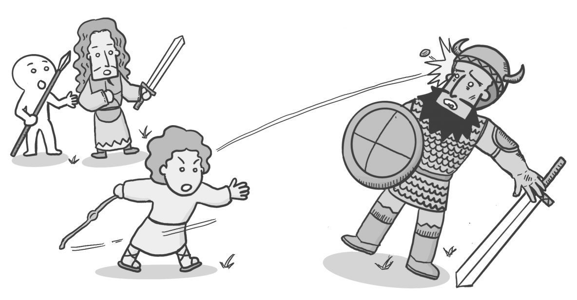 이스라엘은 블레셋과 다시 전쟁을 하게 되었어요. 사람들은 전쟁에서 앞장서서 승리로 이끌어주는 사울 왕을 따랐죠. 그런데 이게 왠일인가요. 블레셋에서 골리앗이라는 거인이 등장했어요. 엄청나게 키와 덩치가 크고, 무겁고 거대한 무기를 들고 나와서 소리쳤어요. 자신과 싸워서 이기는 쪽이 승리를 가져가자고 말했어요. 그러면서 이스라엘 군대를 비웃었습니다.