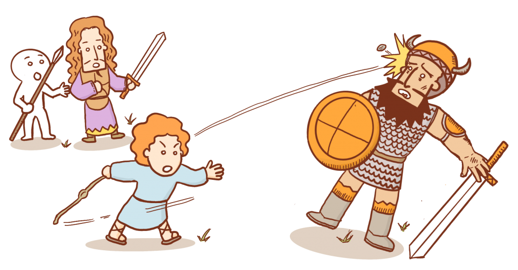 골리앗은 다윗을 보고 비웃었어요. 다윗과 같은 어린 소년은 한 손으로 싸워도 이길 수 있다고 생각했을 거에요. 그래서 다윗을 들짐승의 밥으로 만들어버리겠다고 소리쳤죠. 하지만 다윗은 자신은 칼과 창이 아니라 하나님의 이름으로 싸운다고 말했어요. 승리는 하나님이 주시는 것이기 때문에 다윗은 자기가 이길 거라고 외쳤어요. 그리고는 골리앗에게 달려들면서 물매를 이용해서 돌을 던졌어요. 그 돌은 골리앗의 이마를 정확하게 맞췄고, 골리앗은 한 방에 쓰러져 버렸어요. 아무도 이길 수 없다고 생각했는데, 어린 소년이었던 다윗이 양치기 생활을 할 때 쓰던 무기로 골리앗을 이긴 거에요.