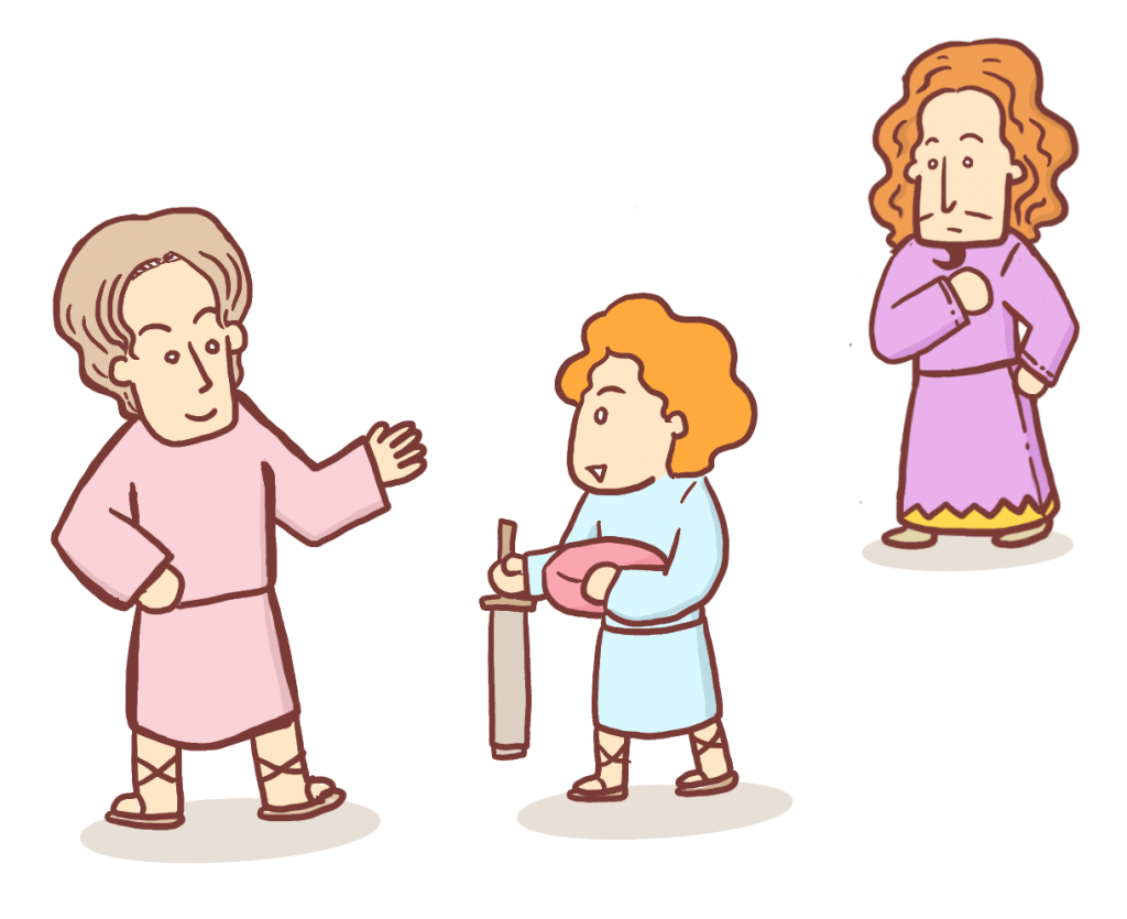그래서 다윗과 요나단은 친구가 되었습니다. 요나단은 다윗에게 자신의 칼과 갑옷과 옷을 선물로 줬어요. 사실 왕자인 요나단이 다윗에게 자기 옷을 주는 것은 다음 왕이 될 사람이 누구인지를 잘 보여주는 장면이었죠.