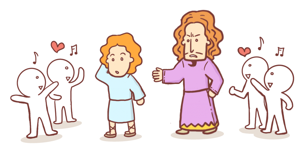 전쟁에서 승리한 사울과 다윗은 왕궁으로 돌아오게 되었어요. 그리고 많은 사람들이 사울과 다윗을 환영했죠. 여인들은 함께 모여서 사울과 다윗을 향해 노래를 불렀어요. 그들은 “사울은 천천이요. 다윗은 만만이라!”라고 노래했어요. 사실 이 노래가 다윗이 사울보다 더 위대하다고 말하는 것은 아니었어요. 사울과 다윗 모두를 칭찬하는 내용이었어요. 하지만 오해할 수도 있는 내용이었죠. 그리고 사울은 오해를 하고 말았어요.