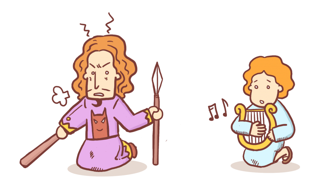 그래서 사울의 마음은 다시 걱정과 분노가 가득하게 되었어요. 예전에 악령에게 시달렸던 병이 재발하게 된 거에요. 악령에 사로잡힌 사울 왕은 또 이상한 행동을 하기 시작했어요. 그래서 다윗은 예전에 왕을 치료했던 것처럼 수금을 가지고 왕 앞에서 연주를 하기 시작했어요.