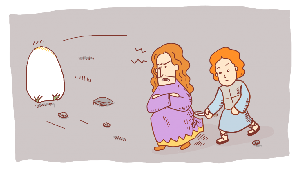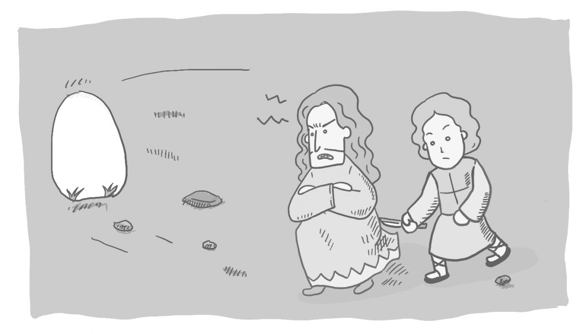 하지만 사울은 다윗을 잡으려는 계획을 포기하지 않았어요. 그래서 사울은 3천명의 군사들을 이끌고 다윗이 있는 엔게디 광야로 달려갔어요. 다윗은 부하들과 함께 엔게디 광야에 있는 한 동굴에 숨어 있었죠. 사울에게 발견되면 죽을 수도 있는 절체절명의 상황이었어요. 그때 사울은 갑자기 화장실에 가고 싶어졌어요. 그래서 부하들을 두고 동굴에 들어갔죠. 화장실이 따로 없으니까요. 그런데 바로 그 동굴이 다윗이 숨어있던 곳이었어요!